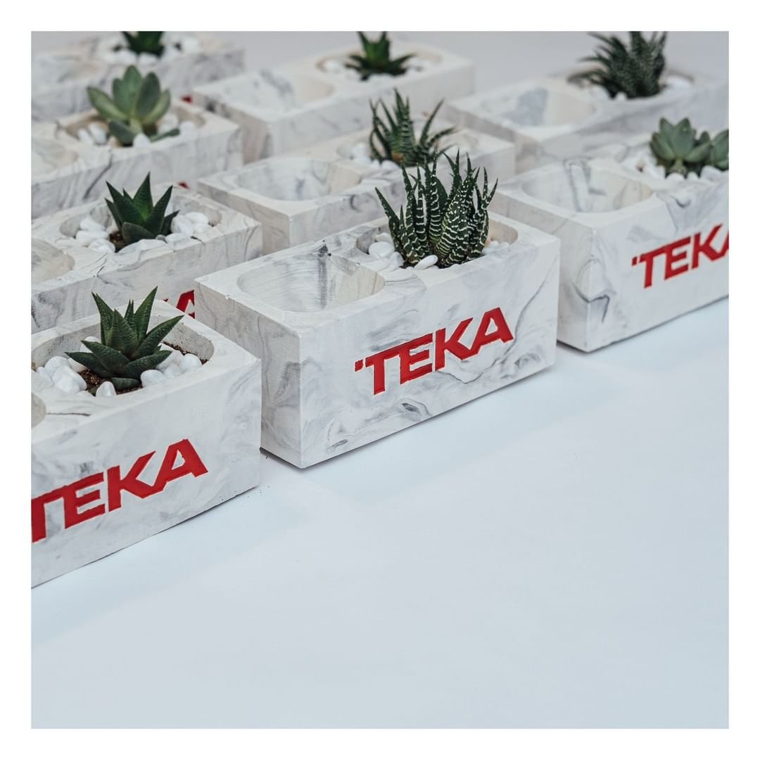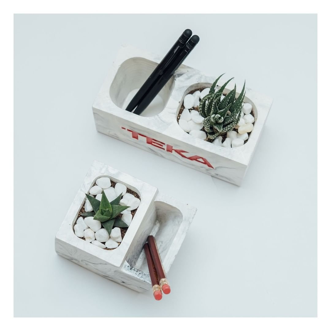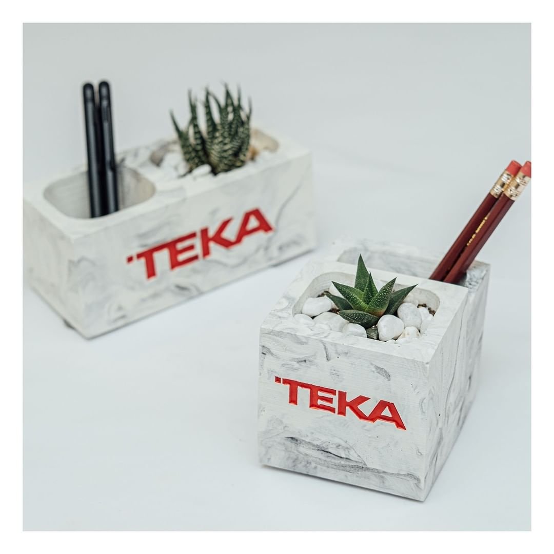 Qələm qabıdibçəklər korporativ mühitdə həm funksional, həm də estetik bir aksesuar olaraq diqqət çəkir. TEKA şirkəti üçün hazırladığımız məhsullar tamamilə əl işi (“handmade”) olaraq hazırlanmışdır. Hər bir qələm qabı və dibçək unikal dizayna malikdir və xüsusi silikon qəliblər vasitəsilə yüksək keyfiyyətli beton materialdan hazırlanır. Epoxy ilə yazılmış loqo məhsulların üzərində çox qəşəng görünür və şirkətin vizual kimliyini gücləndirir.